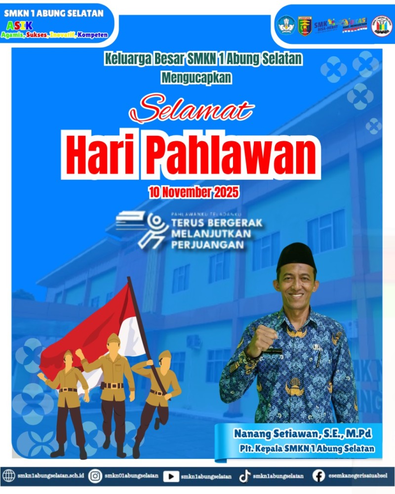 Dalam Memperingati Hari Pahlawan Nasional Tahun 2025 SMKN 1 Abung Selatan Mengadakan Upacara di Lapangan SMKN 1 Abung Selatan, Bapak Ahmad Agus Rama Malik, S.E., M.M sebagai Pembina Upacara dan Peserta Upacara di ikuti oleh seluruh Sekretaris Desa, KUA, Kodim, Polres Abung Selatan serta Dewan Guru beserta Staff , Mahasiswa Magang dan Siswa-siswi SMKN 1 Abung Selatan.